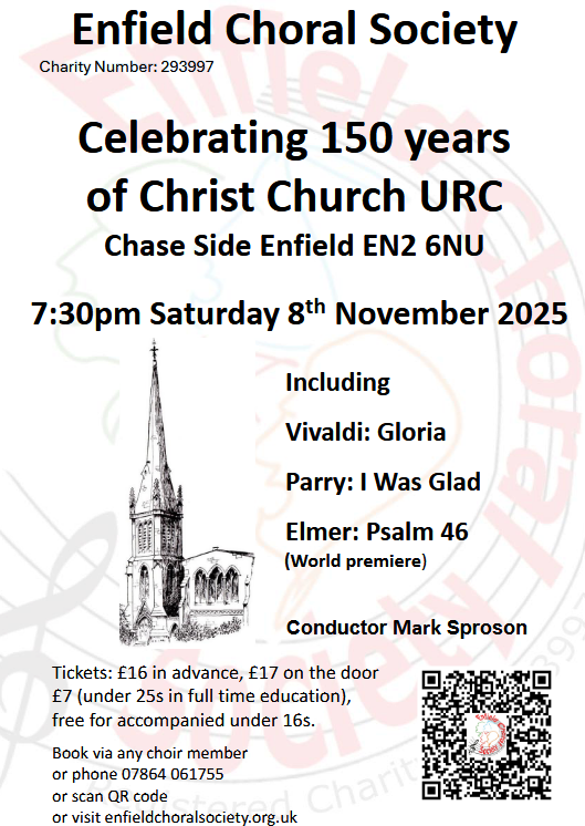 Enfield Choral Society’s next concert on Saturday 8th November 2025 at Christ Church URC Enfield is special in several ways.