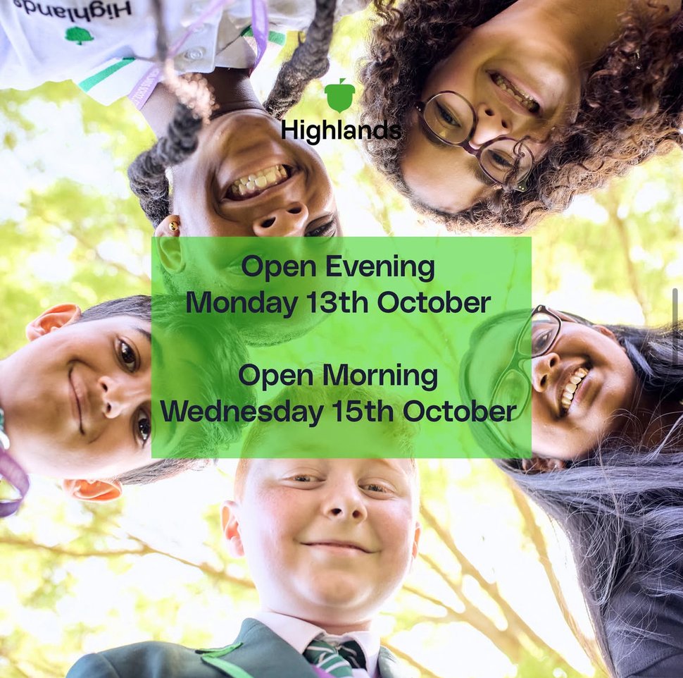 Year 7 Open Morning 2025 - Wednesday 15th October Register for the event now. The registration form to attend our Year 7 Open Morning is now live. All visitors must register online in advance to attend the event. The link to register has been included below. All of our open evening sessions are now fully booked. If you wish to join the waiting list, please visit the open evening page on our website where you can register your interest in attending our Year 7 Open Evening event. Year 7 Open Morning - Wednesday 15th October 2025 15 October 2025, 09:10-15 October 2025, 10:55 Highlands School & Sixth Form-Show on map Event Description We are looking forward to welcoming visitors to our open morning event taking place on Wednesday 15th October 2025. The open morning event will be taking place at the following times: - Wednesday 15th October at 9.10am - Wednesday 15th October at 10.15am Visitors are asked to select one of the following time slots. The session will last 40 minutes. Please do not arrive any earlier than 10 minutes before your chosen session. We kindly ask that visitors attend with a maximum of three people in their group (this includes children). There is limited parking in the school car park and therefore a parking space cannot be guaranteed. We encourage all parents who can walk to the school, or travel without a car, to do so.
