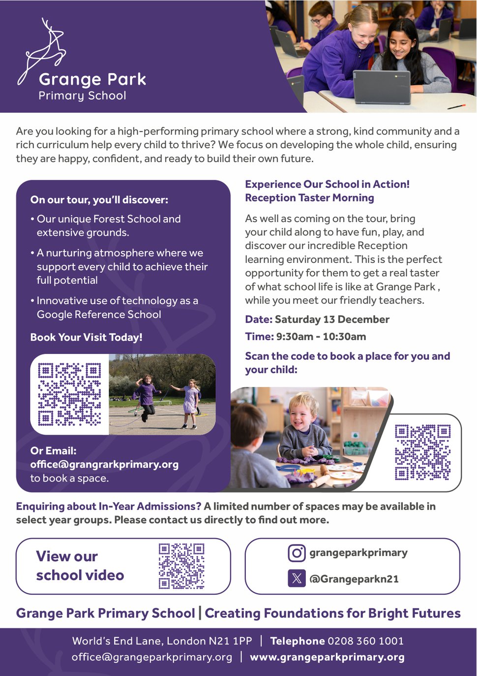 Are you looking for a high-performing primary school where a strong, kind community and a rich curriculum help every child to thrive? We focus on developing the whole child, ensuring they are happy, confident, and ready to build their own future. Experience Our School in Action! Reception Taster Morning As well as coming on the tour, bring your child along to have fun, play, and discover our incredible Reception learning environment. This is the perfect opportunity for them to get a real taster of what school life is like at Grange Park, while you meet our friendly teachers. Date: Saturday 13 December Time: 9:30am - 10:30am Enquiring about In-Year Admissions? A limited number of spaces may be available in select year groups. Please contact us directly to find out more.