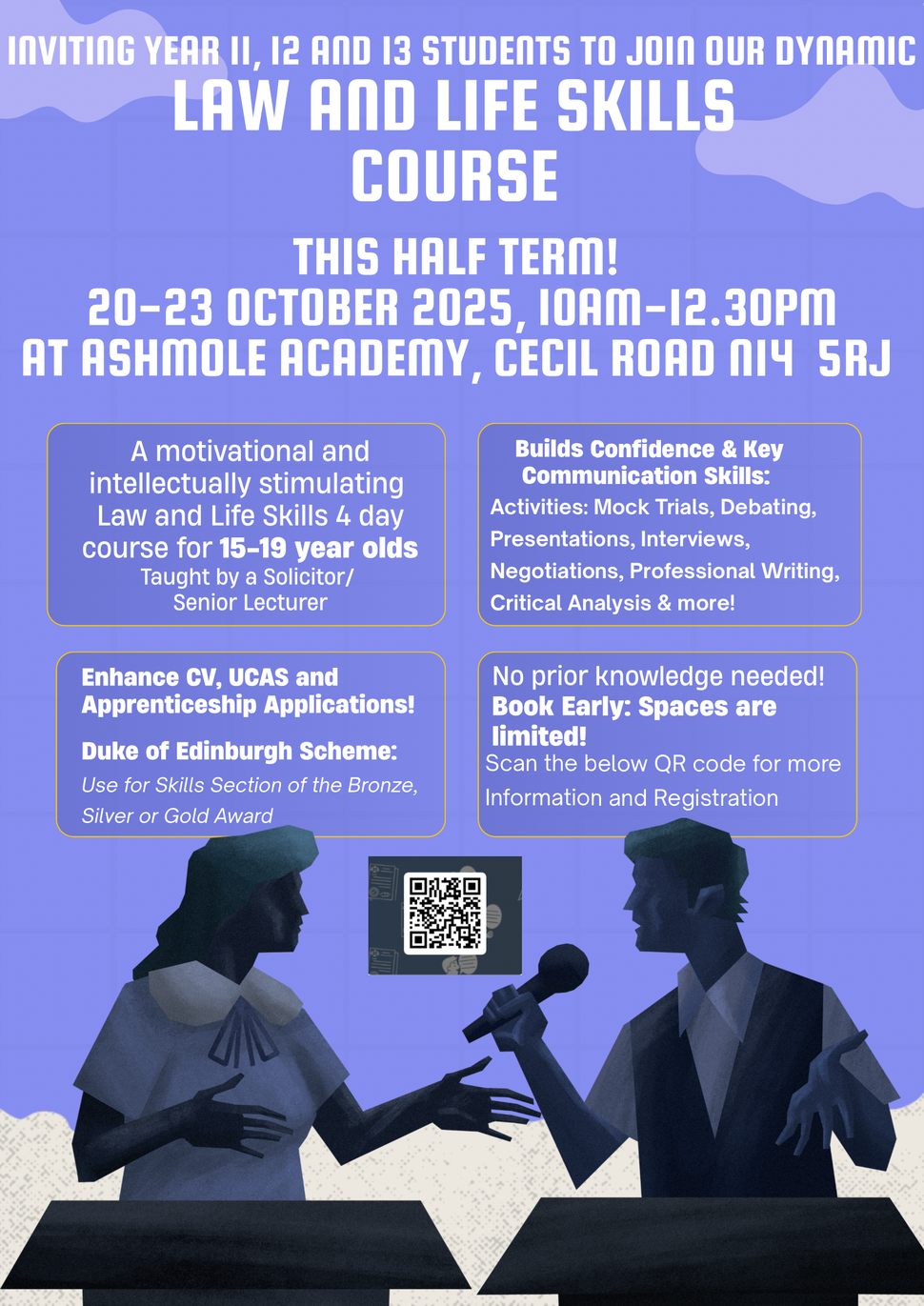 An exciting Law and Life Skills half term course open to all year 11, 12 and 13 students to develop confidence and communication skills through Law based activities such as debating, mock trial, interviews, professional writing, negotiations and more! Enhance UCAS and Apprenticeship applications, and use for the Duke of Edinburgh Skills section. Limited spaces - so book early to avoid disappointment! See Flyer and scan QR code for more info and registration.